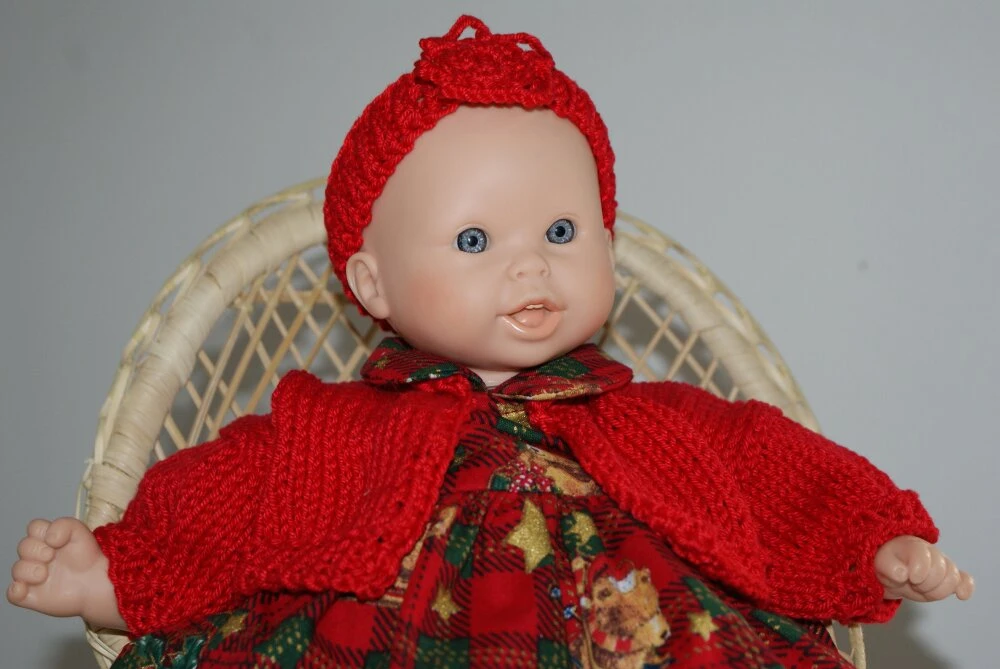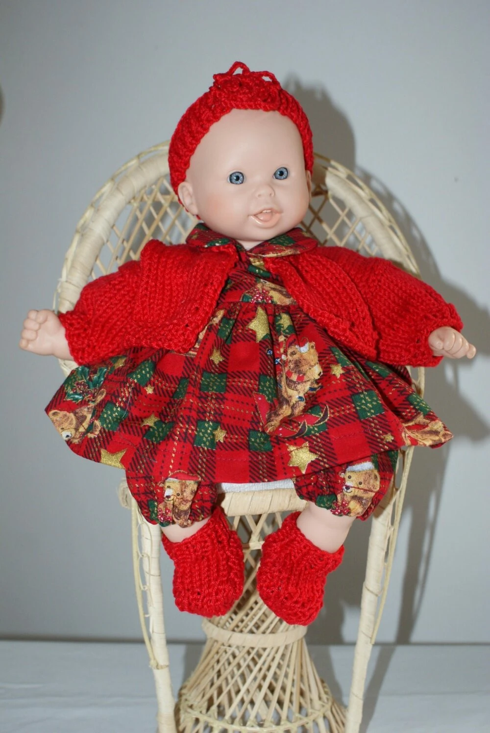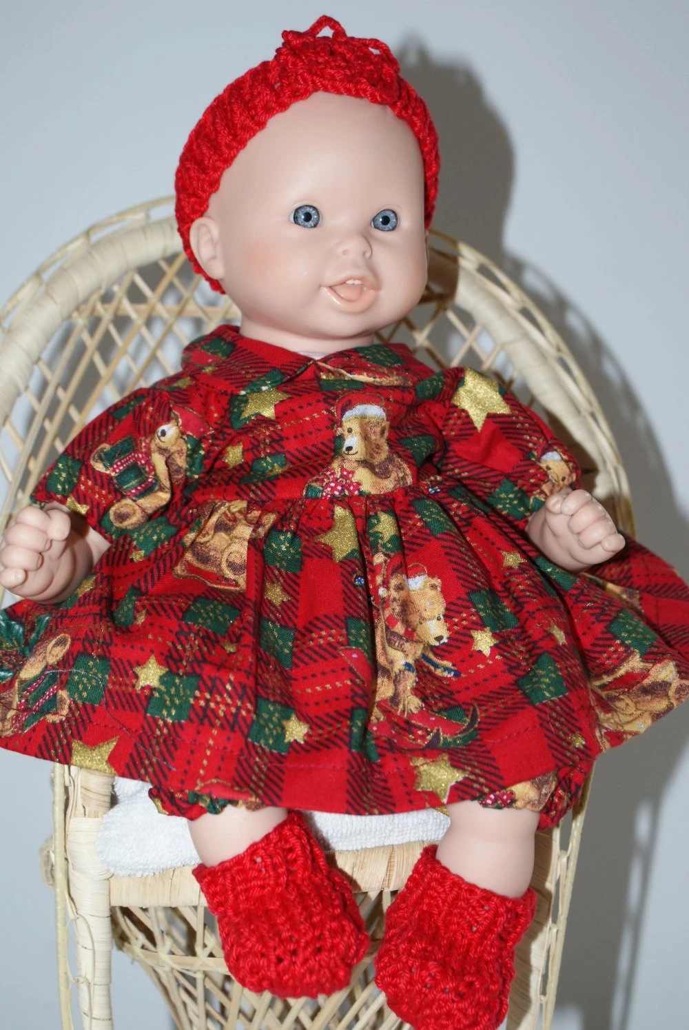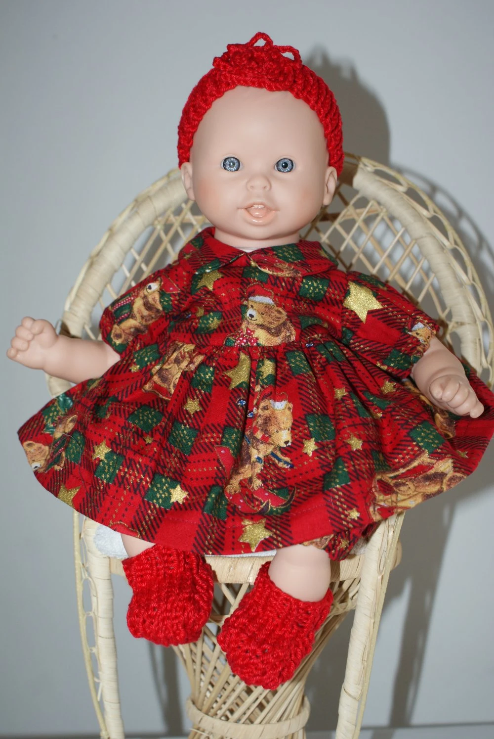 tenue thème Noel pour poupon de 30 cm , composée de 5 pièces : une petite robe fond jacquard rouge et vert imprimée de petits oursons de Noel et fermée par boutons pressions dans le dos , une petite culotte bouffante élastiquée , un petit gilet , un bandeau et une paire de petits chaussons en coton rouge.